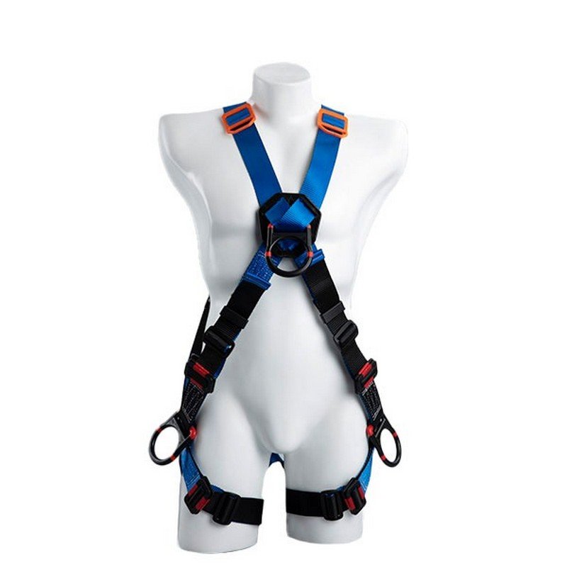 Argollas: El arnés cuenta con cuatro argollas de sujeción estratégicamente ubicadas (una dorsal, dos laterales y una esternal), lo que permite una conexión segura y versátil para diferentes tipos de trabajos en altura, incluyendo posicionamiento, suspensión y detención de caídas, fabricadas en acero galvanizado o acero inoxidable, garantizando alta resistencia a la corrosión y durabilidad incluso en condiciones adversas.