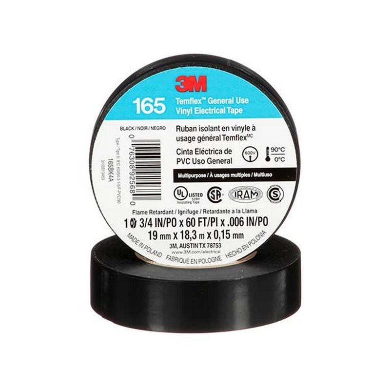 La Cinta Eléctrica de PVC 3M™ Temflex™ 165 es una cinta aislante de vinilo multiuso de buena calidad. Tiene gran resistencia a la humedad y a las condiciones climáticas variables. Es una cinta de cloruro de polivinilo (PVC) ignífuga y adaptable. La cinta 3M Temflex 165 proporciona una gran protección mecánica con un volumen mínimo. Es una cinta aislante certificada por CSA y listada por UL. No se utilizan solventes en el proceso de fabricación.