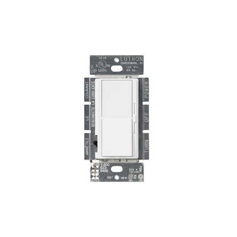 El dimmer switch diva es un atenuador para bombillas LED, LFCA, halógenas y incandescentes atenuables, 120V 150W, color blanco para encender, apagar y en el lado lateral un control para atenuar.