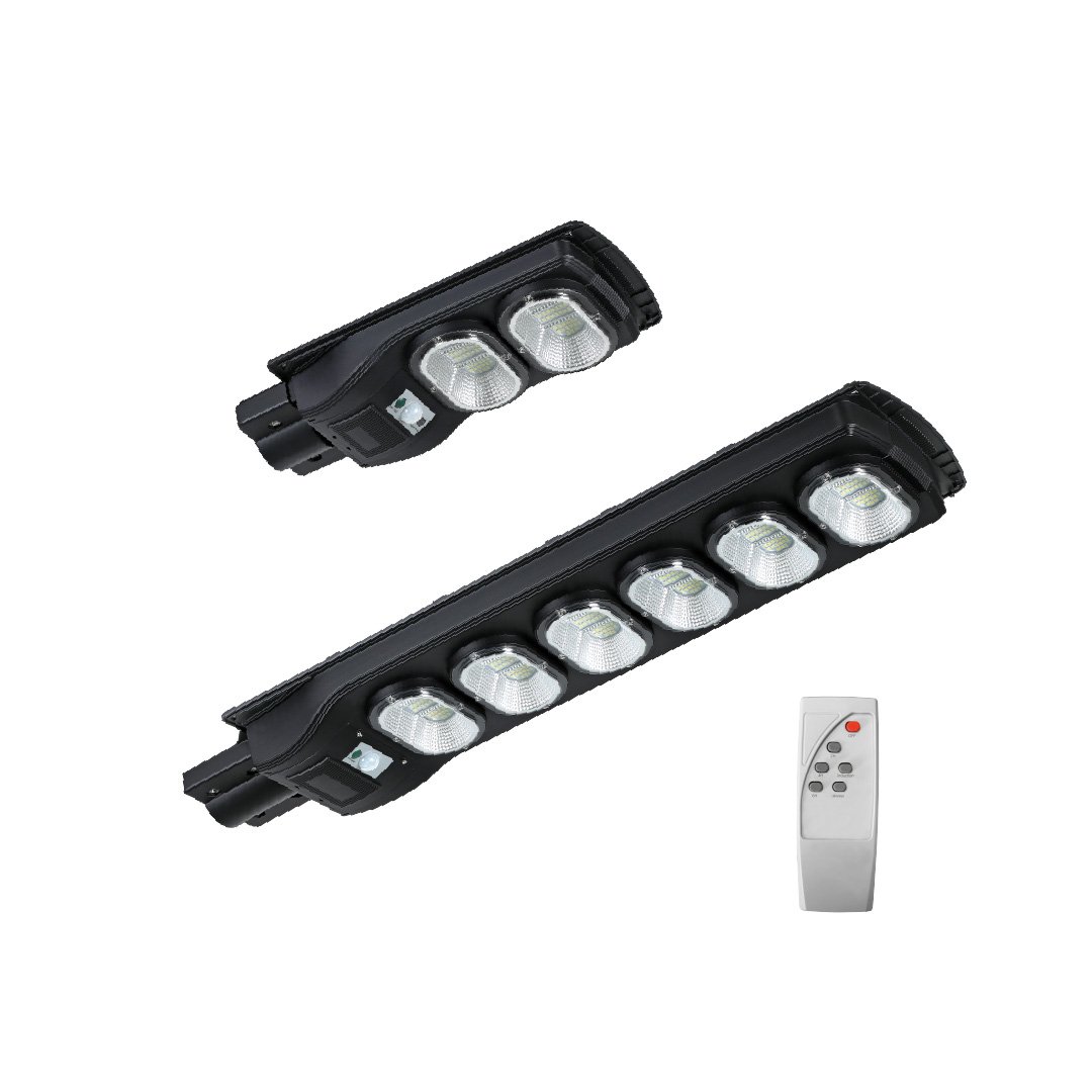 Luminaria solar Sylvania equipada con batería de litio, módulo LED, panel solar policristalino integrados y sensor de movimiento, diseñada para uso residencial. Incluye un control remoto que ofrece diversas opciones para configurar modos de funcionamiento, tiempos y ajustes del sensor.