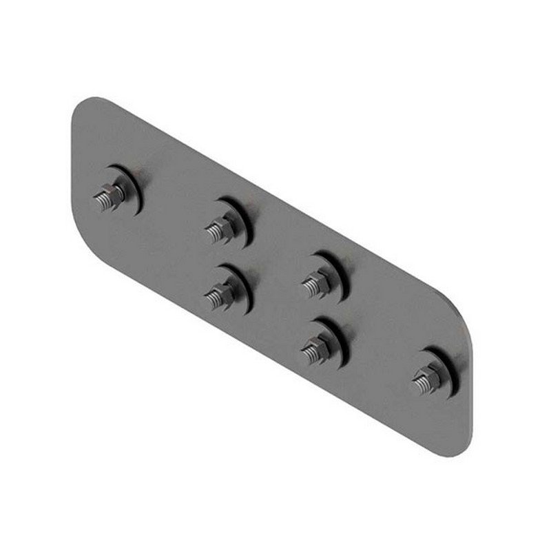 Perforaciones: la platina cuenta con 5 perforaciones, diseñadas para alinear perfectamente con los orificios en los canales tipo TRQ, facilitando una unión firme y segura. Las perforaciones permiten el paso de pernos o tornillos para asegurar la platina al canal.