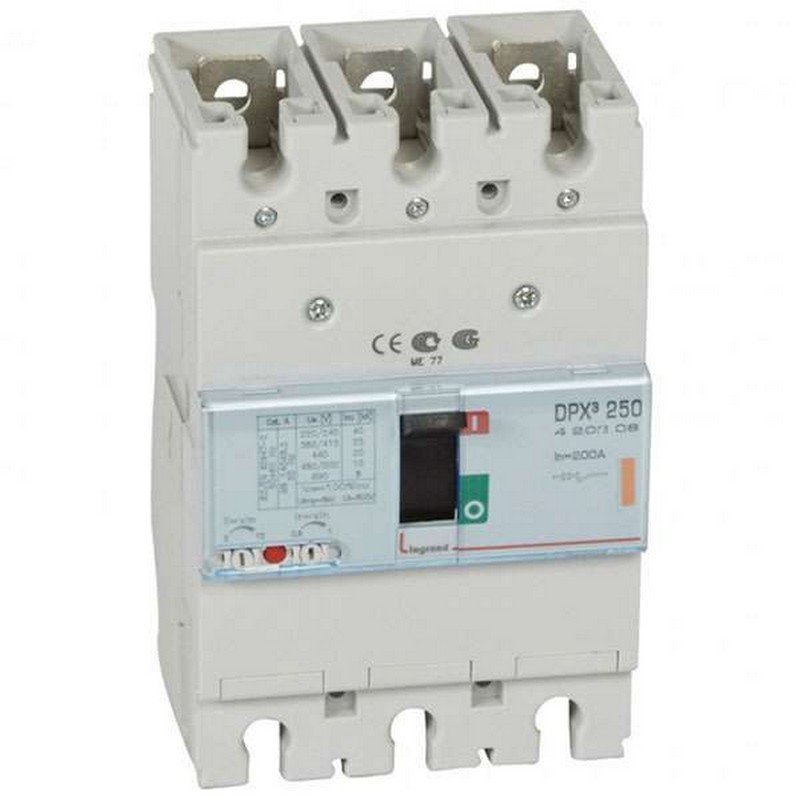 El taco INDUSTRIALustrial DPXɜ250 de LEGRANDrand, con regulación de 3 fases, está diseñado para manejar corrientes de 160 a 200 amperios y tiene una capacidad de INTERRUPTORerrupción de corriente de 40kA a 240V.